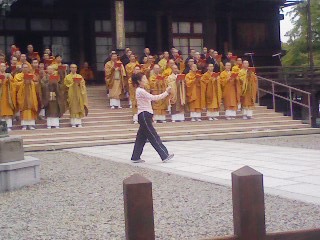 写真中央がリハーサル中の長嶺さんで、後ろにはお坊さんがズラリ。この大人数のお経は背筋がゾクっとなるくらいド迫力でした!